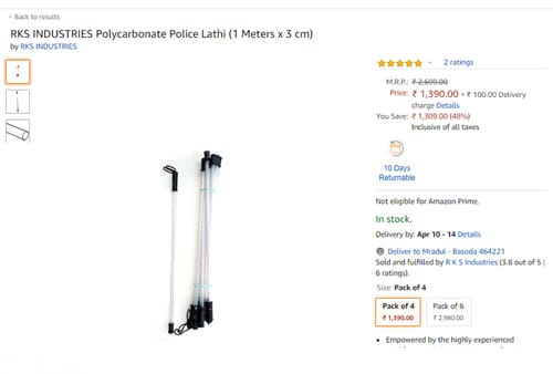 अमेजॉन पर इसके बारे में लिखी जानकारी के मुताबिक यह लाठी पुलिस, रक्षा मंत्रालय और अन्य पुलिस विभागों द्वारा अप्रूव होती है ।